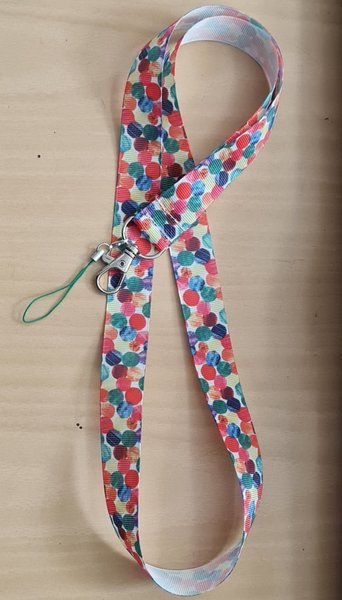 Ett färgglatt nyckelband med ett mönster av prickar i olika färger. Den har en silverfärgad karbinhake och ett grönfärgad snöre.