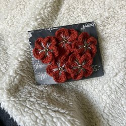 5 st blommor i olika matchande färger virkade av garn i 100% bomull.