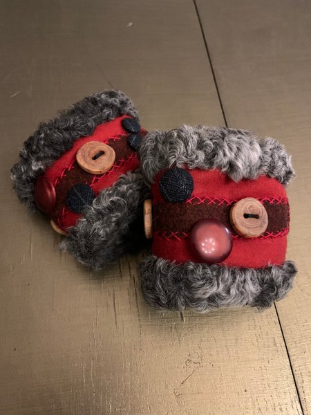 Ett par handgjorda handledsvärmare i rött och brunt med dekorativa knappar och grå päls insida.