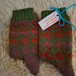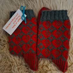 Stickade i ett julrött och grafitgrått naturgarn i 100% ull. Väldigt mjukt garn som håller värmen bra.