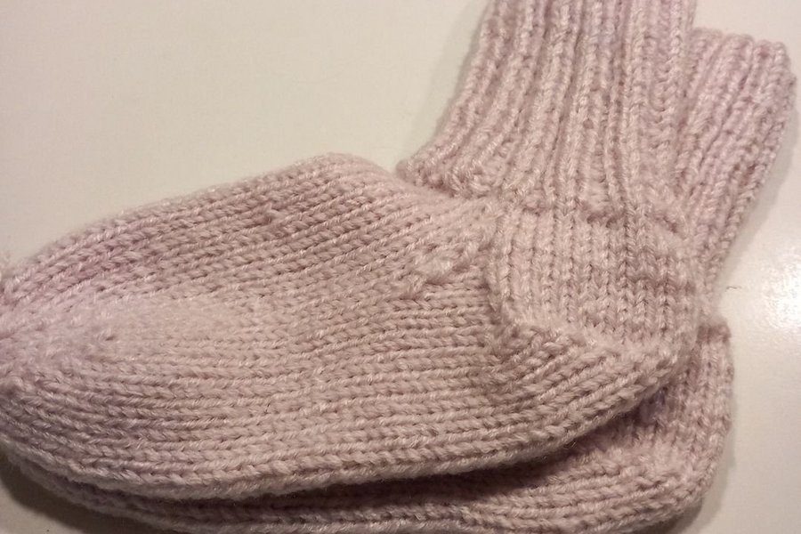 Ett par handstickade sockor i en ljusrosa nyans. Sockorna har ett ribbstickad skaft