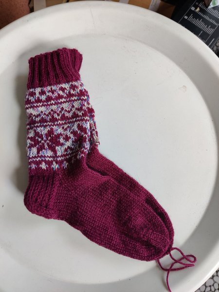Handstickade yllesockor i storlek 31-33. Foten är ca 20 cm och skaftet 17 cm.
