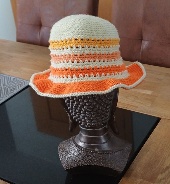 En virkad hatt med ränder i olika färger. Hatten har en bred brätte och en rundad kulle. Färgerna inkluderar gräddvit, orange och gulorange i ett randigt mönster.