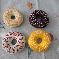 Set med 4 virkade munkar i olika färger. Perfekta som leksaksmat eller dekoration. Munkarna är handgjorda och detaljerade med "strössel" i olika färger.