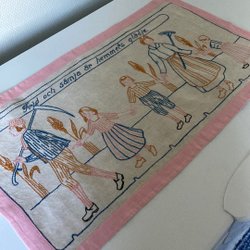 Handbroderad Broderad linneduk, Duk med violer och myrgång