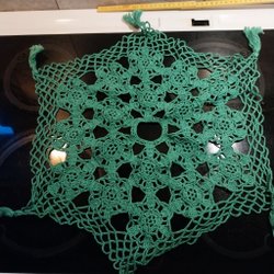 Virkade dukar i olika färger och storlekar.