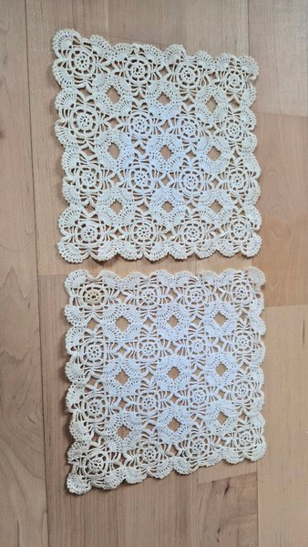 Två stycken handvirkade dukar i vitt. Sidan är ca 18 cm lång. Dukarna virkades på 80-talet av min moster och har gulnat lite med åren. Se bild för egen bedömning.