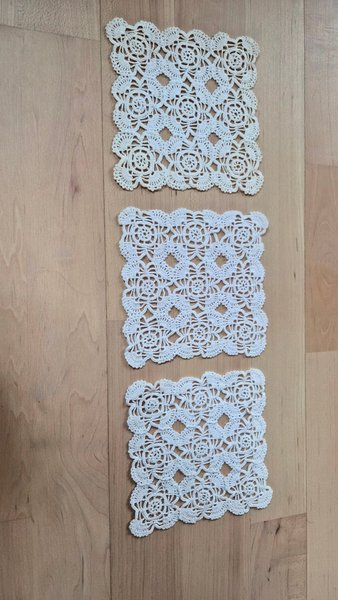 Tre stycken handvirkade dukar i vitt. Sidan är ca 13 cm lång. Dukarna virkades på 80-talet av min moster och har gulnat lite med åren. Se bild för egen bedömning.