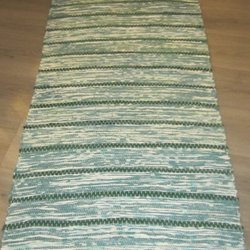 Färgglad trasmatta med blå, orange och grå ränder. 118X72