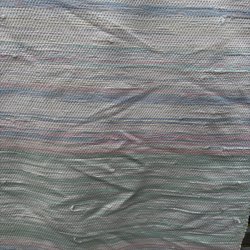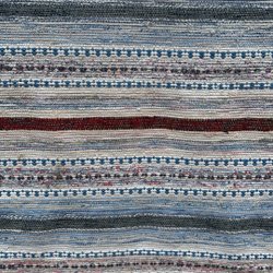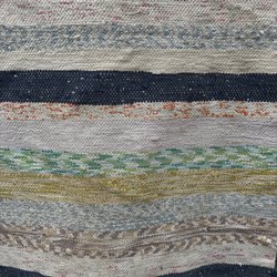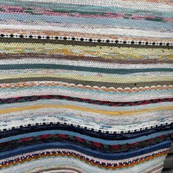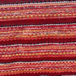 Trasmatta i flerfärgat mönster med inslag av rött och svart. Mattan är vävd i horisontella ränder.