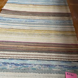 Handvävd trasmatta i flerfärgade ränder. Mattan är 75 cm bred och 260 cm lång. Den har fransar i båda ändar.