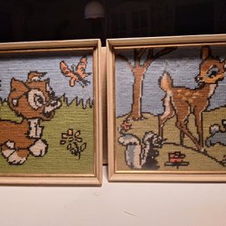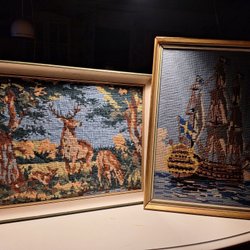 Två broderade tavlor med motiv av kvinnor. Den ena tavlan har en ljusare bakgrund och den andra en grön bakgrund. Båda har detaljerade broderier.
