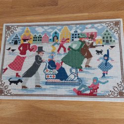 En broderad tavla med ett motiv av en man som sitter på en bänk i en skogsmiljö. Tavlan har en text broderad nedtill,där det står"Lyssna till den granens susning vid hvars rot ditt bo är fäst" mått 45×75cm. Jag tror att det är linneväv som det är broderat på.