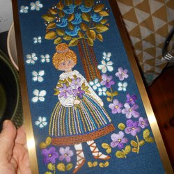 Tavla broderad av mig själv någon gång på 70-talet. Jag tror att det är yllegarn. Träram med guldkant. Ca 32x26,5 cm. Samfraktar gärna. Se gärna mina övriga annonser.