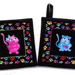 Handgjorda, välsydda i lappteknik och stora: ca 21,5 cm x 21,5 cm varje. Med värmetåligt mellanlägg speciellt för grytlappar. Svart baksida. Bomullstyg. Nytt kvalitetsmaterial. Gediget hantverk.