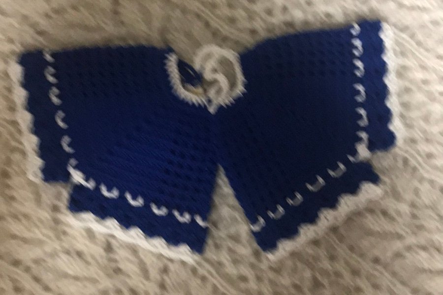 Blå virkade grytlappar med vita detaljer och en vit knapp.