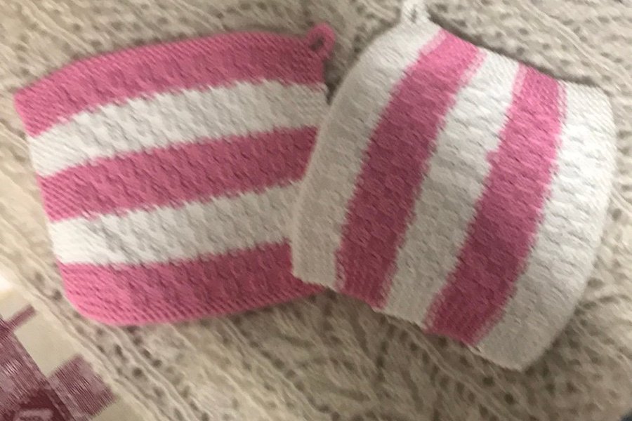 Två grytlappar i rosa och vit färg.