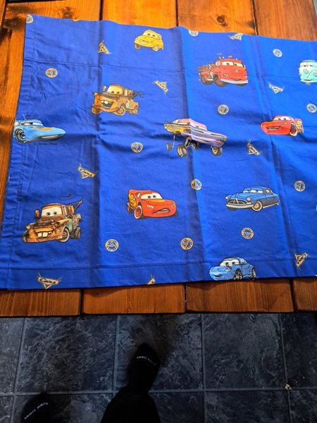 Ett blått med motiv från Disney Pixar filmen Bilar. Gardinkappa har olika karaktärer från filmen tryckta på sig.