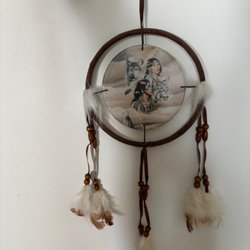 En vacker drömfångare med fjädrar och pärlor. Perfekt för att skapa en lugn och harmonisk atmosfär i ditt hem. Finns en liten skada i lädret, se bild.