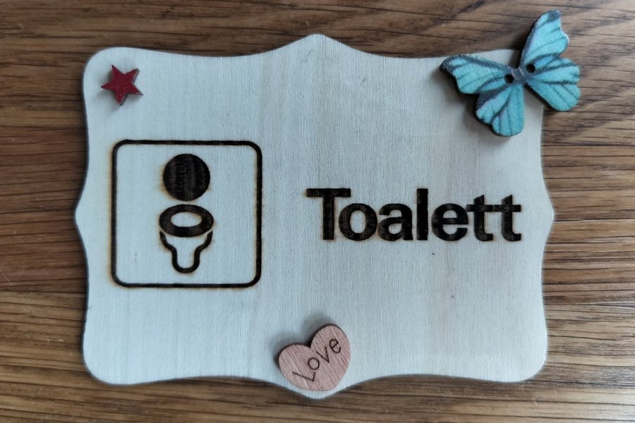 Dekorativ skylt med texten "Toalett" i trä. Självhäftande baksida. Perfekt att sätta på toadörren.