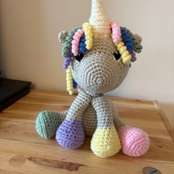 En söt, handvirkad enhörning med färgglad man och svans. Perfekt som gosedjur eller dekoration.