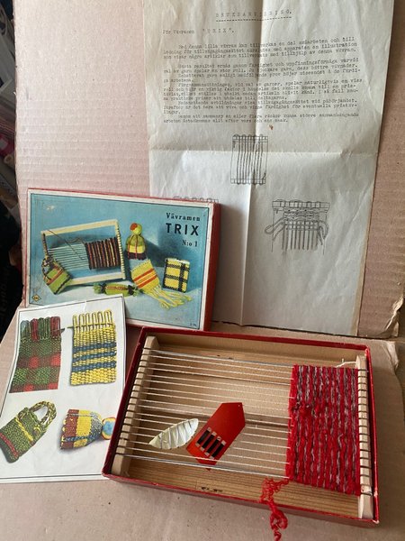 En vintage vävram Trix No:1. Inkluderar en instruktionsmanual med illustrationer och exempel på artiklar som kan tillverkas med vävramen.