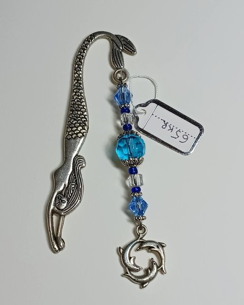 Ett vackert bokmärke med delfiner och vackra glaspärlor.