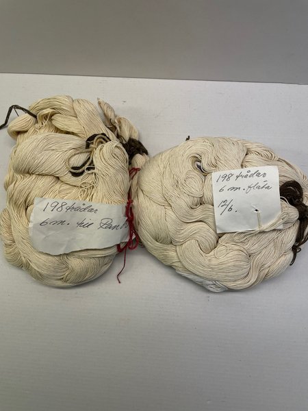 2 st varpflätor till ranor, a 198 trådar per fläta o 6 meter per fläta. Material 12/6 bomullsvarp.