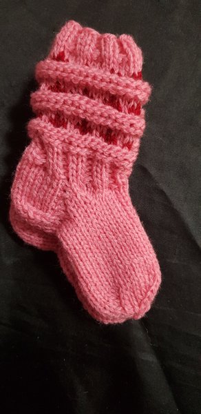 Ett par stickade babysockor i en ljusrosa färg med detaljer i rött. Sockorna har en ribbstickad mudd. Blandgarn 1-2år