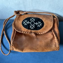 Brun läderväska med flätad axelrem och dekorativt svart tygstycke med tenntrådsbroderi. Väskan har en lockförslutning med en benknapp