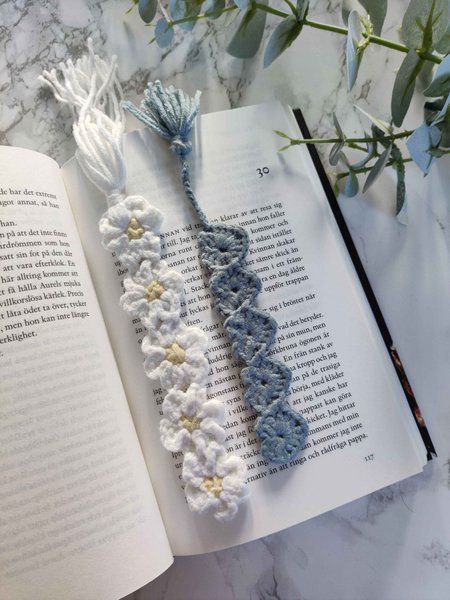 Egenvirkade bokmärken i akrylgarn. Båda två ingår i köpet.