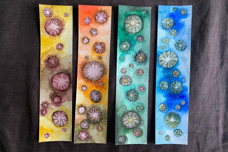 Handmålade bokmärken med unika mönster i akvarell. Pris 99kr styck. Billigare om man köper flera, skicka i så fall ett meddelande.