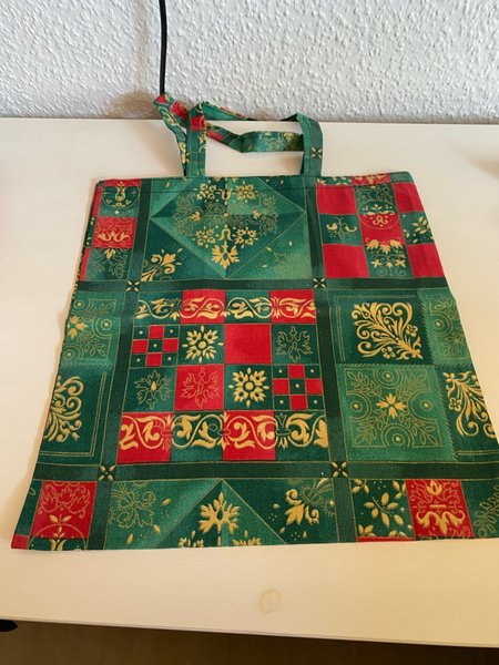 Handsydd tygkasse med liten ficka på insidan. Mått 31,5 cm x 33 cm.