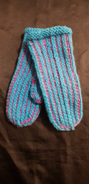 Ett par handstickade vantar i en turkos/ rosa färg. De är varma och sköna. Stickade i lyftteknik. Fritids garn. Medium-large. Porto gäller endast inom Sverige