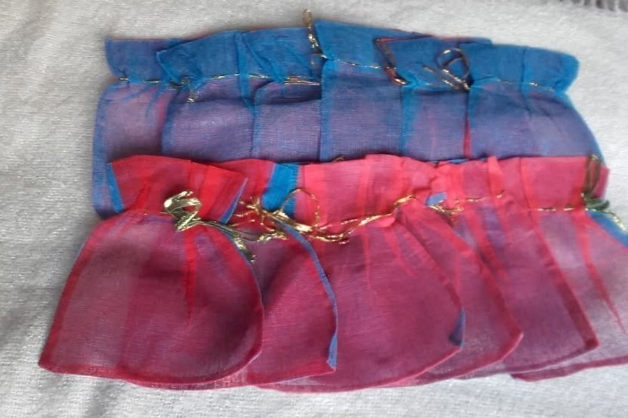 12 mindre påsar för godis eller presenter sydda i tarlatan som är röda på ena sidan och blå på den andra. ca 20 cm breda och 25 cm höga.