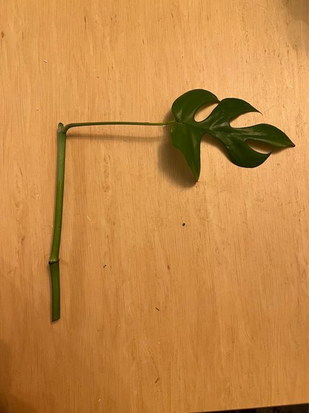 Nyskördad stickling av Rhaphidophora Tetrasperma med ett blad och en nod redo att rota sig.