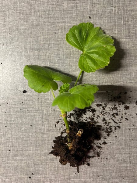 En rotad stickling av pelargon mårbacka Sticklingen skickas i liten kruka med jord.