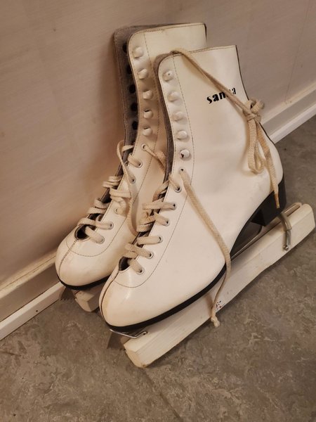 Säljer ett par vita konståkningsskor från märket Sannaa. Skorna är utrustade med snörning och har en klassisk design.
