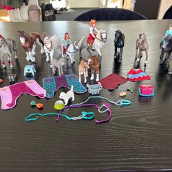 Leksaksset med hästar och en figur Schleich. Innehåller en stor häst, ett föl, en mindre häst och en figur . Perfekt för samlare av Schleich och för barn som älskar hästar och rollspel. Se bilder för skick och för mer information. Vid frågor eller mer bilder,så är det bara att skicka ett meddelande