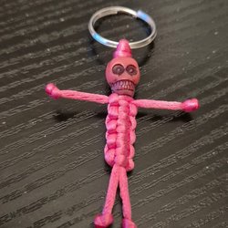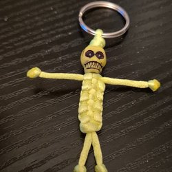 Grön nyckelring med en figur gjord av knuten tråd och ett huvud av en pärla. Perfekt för att hålla reda på dina nycklar eller som en rolig accessoar.