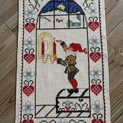 En väggbonad med vintermotiv. Den har en tomte, en fågel och en tekanna över en öppen eld.
