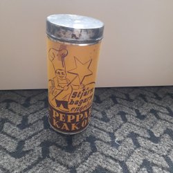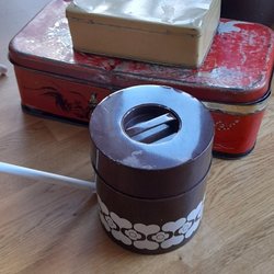 En dekorativ Riley's Assorted Toffees burk i blått med guldfärgad knopp.