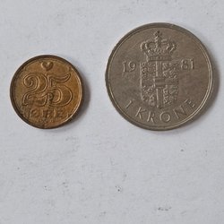 Samling av danska öre. Inkluderar årtalen 1971, 1976 och 1980. Valörer 5 och 10 öre.
