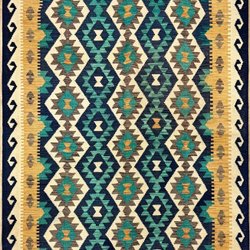 En vacker afghansk kelim matta med ett iögonfallande geometriskt mönster i flera färger. Mattan har fransar längs kortsidorna. (195cm x 151cm)