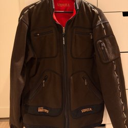 Jackan är i storlek L och jag är 182cm, 85 kg och jackan passar bra på mig. Sparsamt använd och i mycket bra skick.