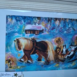 tryck med ett motiv av en häst som drar en släde med en ko och en katt i ett vinterlandskap. Trycket är signerat och numrerat.