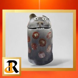 En (1 st) Antik tysk teburk i glaserad keramik från 1920-talet. Den har texten THE på framsidan, blå ränder, trälock och metallspänne gjort av mässing med märktning DRGM 194120. Numret "194120" är det specifika registreringsnumret för designen. "DRGM" står för "Deutsches Reichsgebrauchsmuster", vilket indikerar att designen registrerades i Tyskland under perioden 1891 till omkring 1945.