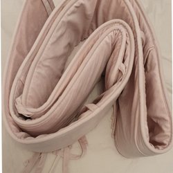 Ett spjälskydd i naturvit/ljusbeige med snören för att fästa den i spjälsängen.