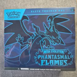 Pokémon TCG: Mega Evolution—Phantasmal Flames Elite Trainer Box. Innehåller booster packs, ett full-art promo kort med Charizard, energi kort, kort sleeves, damage-counter tärningar, en competition-legal coin-flip tärning, en samlarbox och en kod för Pokémon Trading Card Game Live