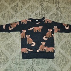 Grå stickad tröja med ett mönster av rävar runt halsen. Storlek 74